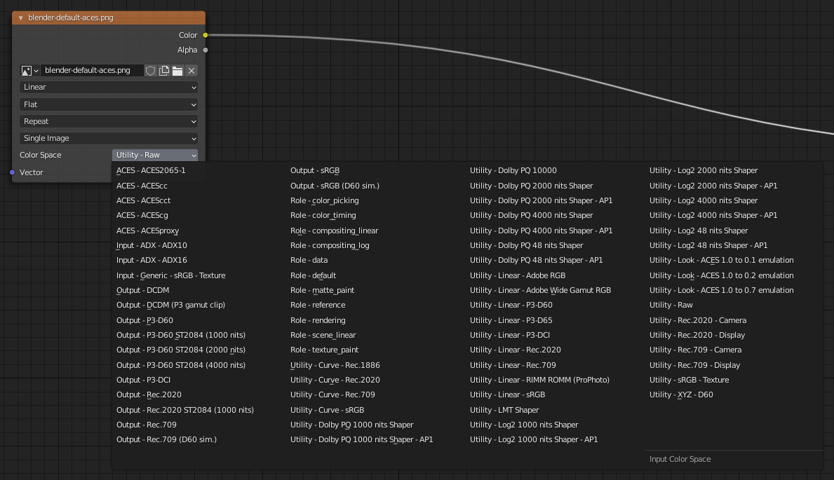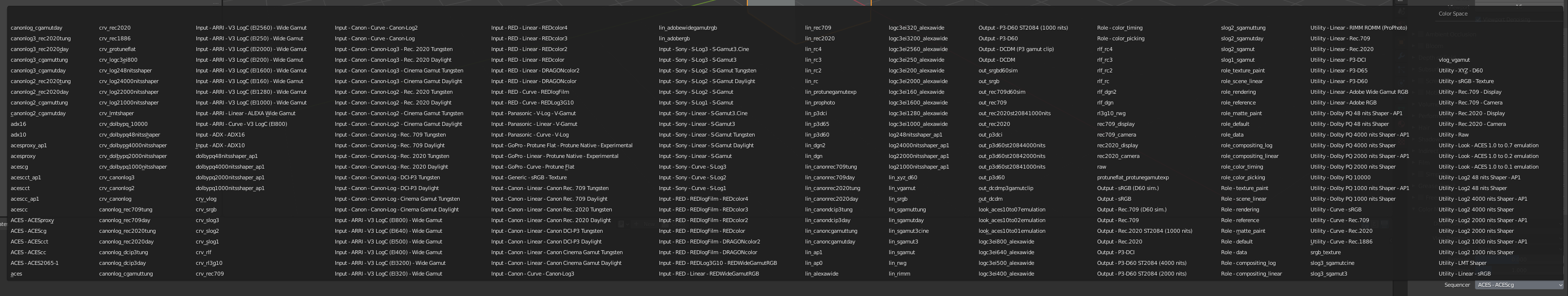 Cependant, la configuration fournie par OCIO pour ACES comporte une longue liste d’espaces colorimétriques correspondant à divers modèles de caméras, très utile en cinéma pour le travail sur les images filmées, mais qui complique la tâche en animation et notamment dans Blender.