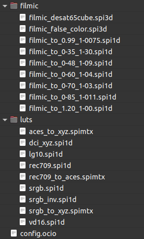 Une configuration OCIO consiste en fait en un ensemble de LUT* accompagnées d’un simple fichier texte contenant la configuration proprement dite, toujours nommé config.ocio.